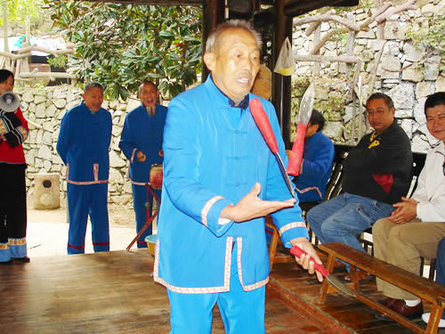 三棒鼓,是以拋三根棒和敲鑼打鼓得名,是土家山寨到處可見的一項(xiàng)以打擊樂器、口頭文學(xué)、表演技藝合為一體的文體活動(dòng)形式。 打三棒鼓通常由三至五人組成,師傅擊鼓唱詞,一人打鑼,一人;ò、花刀。由一人表演,將鼓架擺在前面鼓架上,將鑼掛在鼓架下面,用細(xì)繩系著鑼棒套在腳板上,表演時(shí),口唱詞、手打鼓、腳踩鑼,鑼鼓節(jié)拍是按拋花棒、花刀速度的需要而定。三棒鼓的唱詞是五言四句重復(fù)半句組成。即五字一句,四句為一節(jié)。每小節(jié)的第四句要重復(fù)半句。每一小節(jié)擊響鑼鼓四遍。前三句是每唱完擊三響,最后一句唱完即每小節(jié)結(jié)束時(shí)擊響十下。例如唱:"學(xué)打三棒鼓",打"鏘鏘鏘";唱"學(xué)又學(xué)得苦",打"鏘鏘鏘";唱"三歲學(xué)到一十五",打"鏘鏘鏘";唱"學(xué)起呀,學(xué)起走江湖",打"鏘鏘鏘、鏘、鏘、鏘鏘鏘鏘鏘-鏘"。這一小節(jié),每唱一字為一拍,"鏘"為鑼鼓同鳴聲,每聲占一拍,標(biāo)點(diǎn)符號(hào)也占一拍。每拍的快慢取決于花棒下落的速度,任何一個(gè)花棒下落一次均為一拍。因此,如果花棒拋得低,下落的頻率就快,每拍所占時(shí)間就短,反之,花棒拋得高,每拍占的時(shí)間就長。三棒鼓的第二句和第四句都要求壓韻,一句和三句可壓可不壓. 打三棒鼓的技巧性很強(qiáng),思想要高度集中,拋刀拋棒用力要適度,動(dòng)作要敏捷準(zhǔn)確,稍有疏忽大意,不但表演失敗,還會(huì)被刀劃破手腳或誤傷他人。因此,凡是學(xué)打三棒鼓者,均需經(jīng)常練習(xí)飛拋接技術(shù),做到閉目均能拋接刀棒。因此,土家族青少年經(jīng)常用三個(gè)卵石練習(xí)拋接技術(shù),久而久之,熟能生巧,不但會(huì)拋棒,而且能拋刀。 打三棒鼓的鑼鼓曲牌不變,但唱詞多種多樣,除了固定的《十二月花》等唱詞外,均為即興編詞隨口而唱,唱三棒鼓歌的人,都是腦筋靈活、口才伶俐者。 |