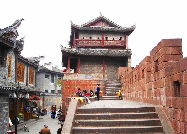 鳳凰北門古城樓圖片 到清朝,古城的軍事地位日顯重要,先后在這里設(shè)鳳凰廳、鎮(zhèn)竿鎮(zhèn)辰沅永靖兵備道治所,古城的建設(shè)也得到加強?滴跷迨哪辏1715年)遂將磚城改建為石城,北門定名為“壁輝門”,一直保存至今。北門古城樓采用本地紅砂條石筑砌,做工考究,精鉆細琢。城門呈一半月拱,有兩扇鐵皮包裹。圓頭大鐵釘密鉚其上的大門。城樓用青磚砌筑,重檐歇山頂,穿斗式木結(jié)構(gòu),石座卷頂。城樓對外一面開槍眼兩層,每層4個,能控制防御城門外一百八十度平面的范圍。北門城樓與東門城樓之間城墻相連,前臨清澈的沱江,既有軍事防御作用,又有城市防洪功能,形成古城一道堅固的屏障,雖幾經(jīng)戰(zhàn)火,仍巍峨聳立于沱江河岸。 |