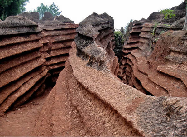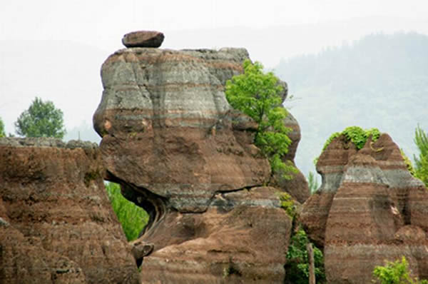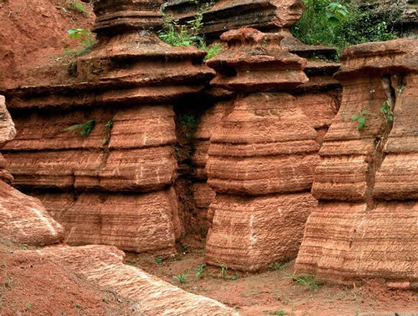 紅石林 告別船工后一切便突然安靜下來(lái),過山谷的小路沒有人家,偶爾傳來(lái)幾聲清脆的鳥叫。穿過幾座隘口,峰回路轉(zhuǎn)后“石林”漸漸露臉,石頭的顏色是由灰白到棕紅,變幻而又使人聯(lián)想。間或一棵參天大樹,或是綠竹三兩棵,則又是另一番景致了。于高于低、于肥于瘦的石林,于石于樹、于濃于淡的色彩,顯得雄奇又雋秀,并透露出一種清靈飄逸。 這些石柱不但顏色各異,而且大小不等。有的高達(dá)七、八米,而有些則像半埋于地下的巨獸骨架。一位村民告訴記者,現(xiàn)在石林沒有以前壯觀,都長(zhǎng)渣子(灌木)了。原因是由于山頂樹木減少,雨水將泥土帶下山,很多石頭都被埋在土下,后來(lái)這些地方都開墾了農(nóng)田,石林也被永久覆蓋。 由于泥土覆蓋,石林被切割成一個(gè)個(gè)小區(qū)域,有些隱蔽在果林中,而有些則像突然從天而降,散落田間。