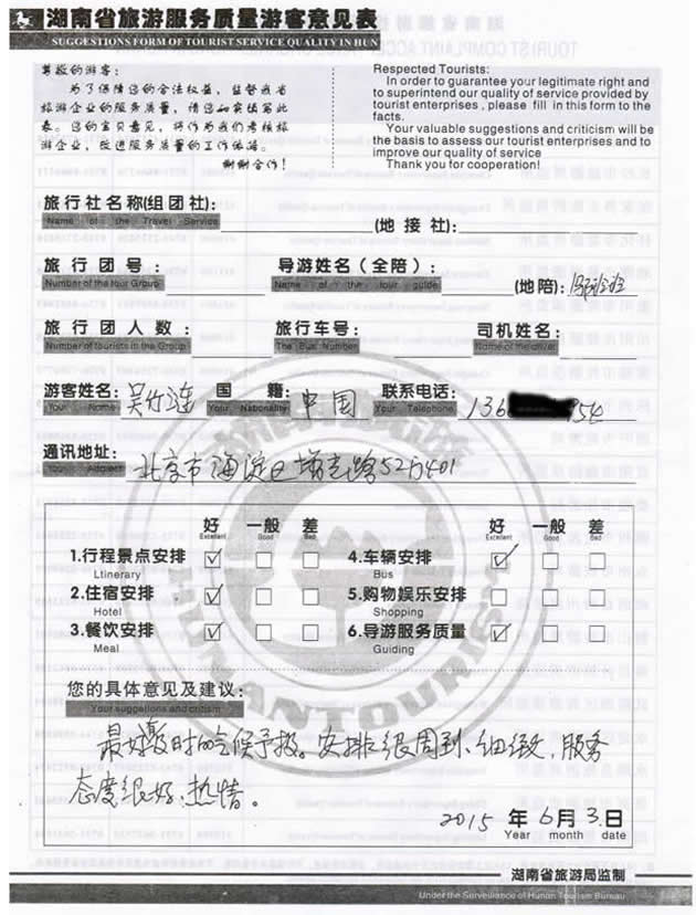 5月下旬,北京吳先生一行四位貴賓與湖南西部(張家界)中國國際旅行社工作人員——王丹取得聯系,經過商談,雙方達成協議并簽訂旅游合同,于6月3日抵達張家界,開始張家界之旅。此次行程是由我社優(yōu)秀導游——烏玲玲,負責旅游接待工作,烏導在旅游過程中講解詳細,客人也很滿意,在意見表上寫到:最好有及時的天氣預報,安排很周到,細致,服務態(tài)度很好,很熱情!同時也感謝吳先生選擇湖南西部(張家界)中國國際旅行社,以及您對湖南西部國旅的信任與支持。我們會繼續(xù)努力,做好旅游接待工作。期待下一次與您的合作,祝您愉快!