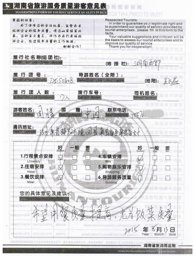 8月初,湖南邵陽周先生一行17位貴賓與湖南西部(張家界)中國國際旅行社工作人員——小王取得聯(lián)系,經過商談,雙方達成協(xié)議并簽訂旅游合同,于8月9日抵達張家界,開始張家界之旅。此次行程是由我社優(yōu)秀導游——吳飛燕負責旅游接待工作,吳導在旅游過程中講解詳細,客人也很滿意,在意見表上要求我們:希望用餐質量提商,尤為飯菜質量,我們感謝周先生為我社提出了寶貴意見,謝謝周先生。同時也感謝周先生選擇湖南西部(張家界)中國國際旅行社,以及您對湖南西部國旅的信任與支持。我們會繼續(xù)努力,做好旅游接待工作。期待下一次與您的合作,祝您愉快!