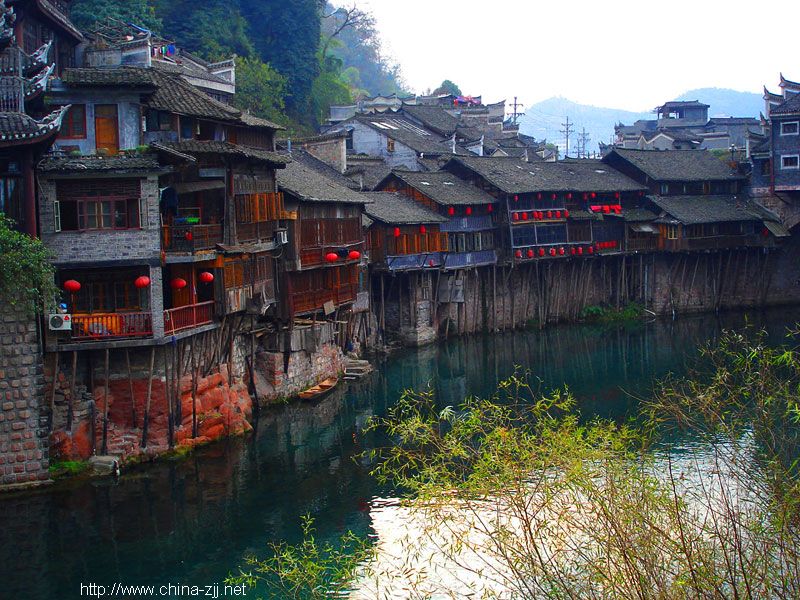 【鳳凰古城位于沱江之畔、群山環(huán)抱、關(guān)隘雄奇、碧綠的沱江依著城墻緩緩流淌,疊翠的南華山麓倒映江中,江中漁舟游船數(shù)點,山間暮鼓晨鐘兼鳴,懸崖上的吊腳樓輕煙裊裊,碼頭邊的浣紗姑笑聲朗朗,兩岸已有數(shù)百年歷史的吊腳樓更是別有一番風味;順水而下穿過虹橋一幅江南水鄉(xiāng)的畫面便展現(xiàn)于眼前--萬壽宮、萬名塔、奪翠樓……一種遠離塵世的感覺悠然而生;鳳凰--猶如“一幅濃墨淺彩的中國山水畫”】