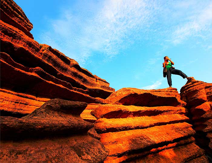 二、遙遠的地質(zhì)年代 位于紅石林國家地質(zhì)公園內(nèi)的寒武紀地質(zhì)剖面發(fā)育完整、巖相穩(wěn)定,古生物化石豐富,是我國寒武紀地層最好的典型地層剖面。這一典型地層剖面一旦經(jīng)國際專門機構(gòu)確定,將構(gòu)成完整的寒武紀第二段國際標準地層剖面。 在紅石林的石頭上到處可以看見許多化石,它們千姿百態(tài)栩栩如生,這些化石的前生就是角石,又稱為“寶塔石”或“中華角石”。是研究海洋環(huán)境和劃分地層時代的標準化石之一,具有很高的科研、觀賞性和收藏價值,能給人無限的遐想……