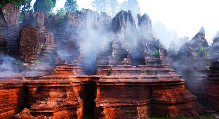 三、天下唯一的自然奇觀 走進古丈紅石林國家地質(zhì)公園,就如同走進了一個夢幻般的世界,成柱成片的紅色石林、石崖、石墻、石峰,分布在群山峻嶺之中。石林造型千姿百態(tài),有的象總統(tǒng)頭像,巨人屹立,有的如神龜探海,鷹擊長空;有的像紫荊花怒放,海洋冰床,有的像城堡峰塔,大廈高樓,有的如樓蘭古城、駝鈴聲聲,有的像乳燕待哺、蝸牛搬家、有的如七彩迷宮、利劍刺空;有的像航母巡游、石兵列陣;有的如少女出浴、觀音坐蓮;有的像石鞭候主、靈龜探海;有的如棕熊迎客、天狗吠日;有的如水獺望云、母雞搗窩……尤以“大地劇場”、“巨人園”、“古城故宮”為奇石絕景中的最佳。